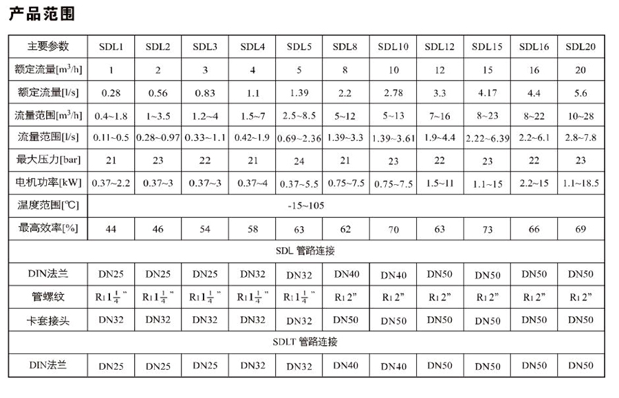 SDL20/SDLT20是一種多功能產品,可以輸送從自來水到工業液體的各種不同介質,適用于不同溫度、流量和壓力范圍。